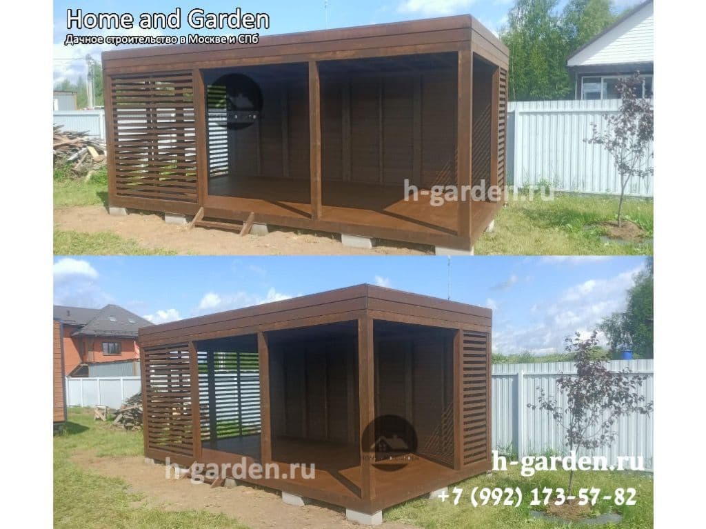 И конечно же более усиленный конструктив угловых и опорных стоек, стеновые комплекты также придают беседке дополнительную прочность.